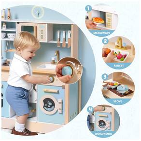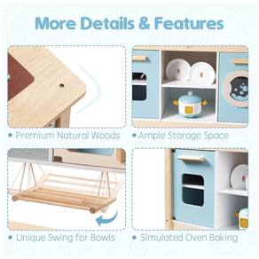 Esta cozinha de brincar é perfeita para o seu pequeno chef. Feita de madeira maciça, ela é robusta e durável. Este conjunto de cozinha de madeira brilhante e colorido é um brinquedo de jogo clássico que inspira brincadeiras imaginativas precoces, ajudando as crianças a entender o conceito de fazer comida para comer. O conjunto contém tudo que os pequenos chefs gourmet podem precisar para preparar comida, incluindo botões que giram para fazer um som de clique e adicionar realismo à brincadeira de faz de conta. Este brinquedo de RPG permite que seus filhos dêem o máximo à imaginação e proporcionem muita diversão, desenvolvendo seus interesses e hobbies, exercitando a habilidade prática e melhorando a expressão da linguagem e as habilidades sociais no jogo. Este conjunto de cozinha é ideal para sessões de RPG criativas e também é um ótimo presente para crianças, já que promove destreza e coordenação olho mão.