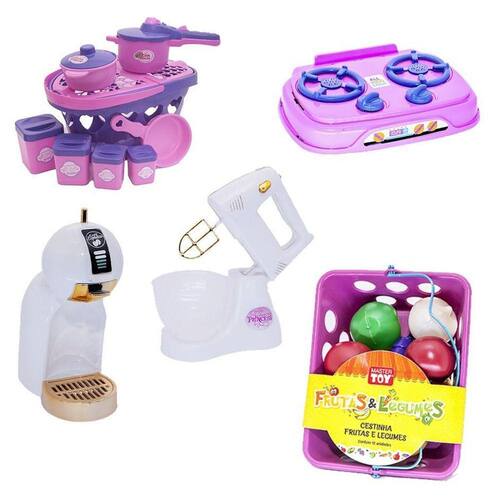O kit vem com jogo de panelas, potinhos de mantimentos, cafeteira, fogão cooktop, batedeira, mercadinho com frutas e legumes