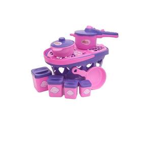 O kit vem com geladeira com comidinhas diversas, jogo de panelas, potinhos de mantimentos, cafeteira, fogão cooktop, batedeira