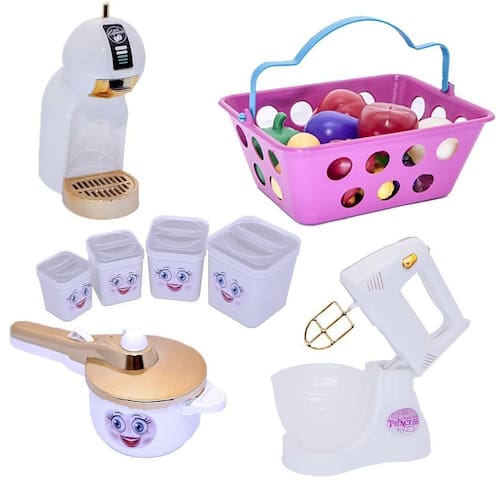 O kit vem com panelinha de pressão, cafeteira, mercadinho com frutas e legumes, batedeira, potinhos de mantimentos