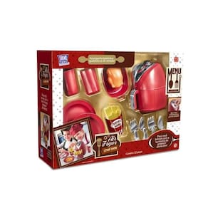 O kit vem com batedeira, panelinha de pressão, air fryer com comidinhas