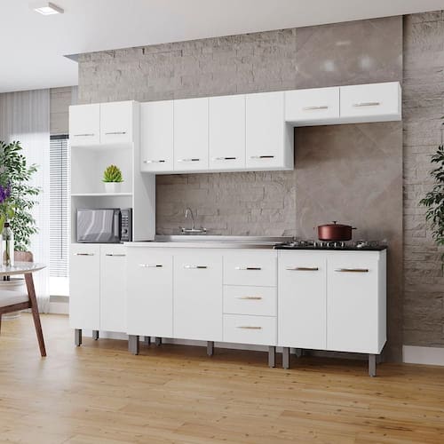NÃO ACOMPANHA PIA E COOKTOP!Balcão para pia de 120cm.Abertura do Tampo para Cooktop 5 bocas.Este móvel de cozinha completa apresenta um design moderno e funcional, com armários superiores e inferiores, gavetas, nichos abertos e espaços dedicados para eletrodomésticos. Conta com puxadores horizontais e pés elevados que facilitam a limpeza e garantem praticidade no dia a dia. É ideal para organizar o ambiente com estilo e eficiência, aproveitando bem o espaço disponível.Dimensões do Balcão:Altura: 82,70 cmLargura: 118 cmProfundidade: 50 cmDimensões do Paneleiro:Altura: 197 cmLargura: 60 cmProfundidade: 37,8 cmDimensões do Áerio:Altura: 52 cmLargura: 118 cmProfundidade: 27 cmDimensões do Áerio Geladeira:Altura: 22 cmLargura: 79 cmProfundidade: 27 cmDimensões do Móvel para Cooktop:Altura: 83 cmLargura: 75 cmProfundidade: 50 cmRecomendações de limpeza:-Limpar com flanela limpa e seca. Não molhar o móvel e não expor em lugar úmido ou próximo de fontes de calor. Não usar produtos abrasivos.Diferenciais da Cozinha Íris;- Material da Estrutura: fabricado com MDP12/15mm- Detalhes do Balcão: Dobradiças Reforçadas; Corrediças Telescópias; Puxadores Horizontais, finalizados com um excelente acabamento;