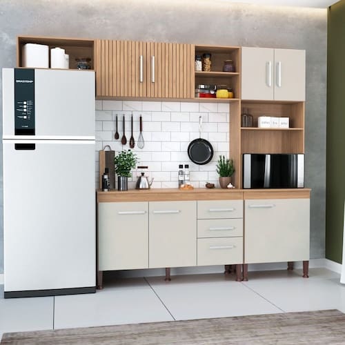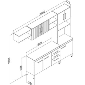 Projetada para atender às necessidades modernas, a Cozinha compacta Isabelle combina praticidade, estilo e durabilidade. Seu design inteligente e modular permite que você crie o layout perfeito para o seu espaço, adaptando-se às dimensões e às demandas do seu lar. Acabamento da Prateleira: Pintura UV Escala de Brilho da Prateleira: Fosco Acabamento da Gaveta: Pintura UV Acabamento da Porta: Pintura UV Escala de Brilho da Porta: Fosco Acompanha Tampo: Sim Altura dos Pés: 17 cm Ambiente Principal: Cozinha Complexidade da Montagem: Média: pode ser montado por mais de uma pessoa e/ou necessite de maior conhecimento para montagem Cor: MEL / OFF WHITE Cor do Produto: Mel / Off White Cor Interna: MEL Escala de Brilho: Fosco Espessura do Material da Estrutura: 12 mm Espessura do Tampo: 12 mm Gaveta com Chave: Não Itens Inclusos: 1 BALCÃO 1 KIT L Manual de Montagem e Instalação: https://cdn2.madeiramadeira.com.br/atributo/movelbento/2032523-3952-17177677692849.pdf Material da Dobradiça/Corrediça da Porta: Aço Material da Gaveta: MDP Material da Porta: MDP Material da Prateleira: MDP Material do Tampo: MDP Material dos Pés: ABS Medida de cada item (A x L x P): 199 X 240 X 39 , 79 X 120 X 39 Necessita Montagem: Sim O Balcão Acompanha Pia: Não Origem do Produto: Nacional Pés Reguláveis: Sim Peso: 64 kg Peso Máximo por Gaveta: 3 kg Peso Máximo por Prateleira: 5 kg Possui Pés: 09 Possui Portas: Sim Possui Prateleiras: Sim Possui recorte para Cooktop: Não Possui Rodízio: Não Recomendações de Uso, Manutenção e Limpeza: Antes de limpar recomenda-se que seja retirada toda a poeira com um espanador ou flanela seca para evitar riscos na superfície, após utilize um pano umido em água, macio e limpo. Sapatas Niveladoras: Não Sistema de Montagem: PARAFUSO, CAVILHA Suporta Até (kg): 80 kg Tamanho Indicado da Pia: 120CM Tipo de Corrediça da Gaveta: Metálica Telescópica Tipo de Dobradiça da Porta: Simples Tipo de Puxador da Gaveta: Externo Tipo de Puxador da Porta: Externo