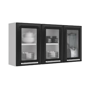 Kit Balcão Branco c/ Armário Aéreo 3 Portas 3 Vidros Preto e 1 Armário Aéreo 1 Porta Horizontal Branco