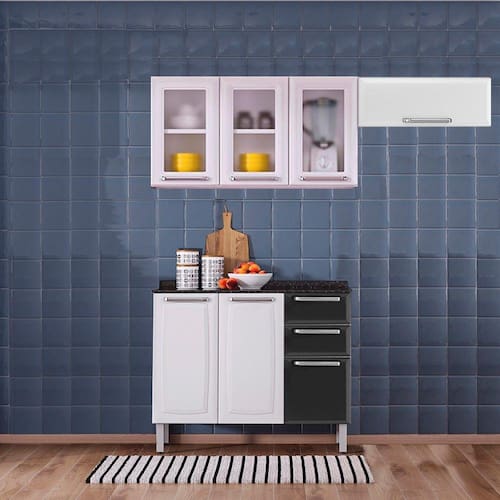 Modelo: Balcão Cozinha Itatiaia Luce 2 Portas 3 Gavetas Preto IG3G2-105 + Armário Aéreo 3 Portas 3 Vidros Luce Branco + 1 Armário Aéreo 1 Porta Horizontal Branco Linha: Luce Material: Aço Pintura / Revestimento: corpo e porta revestidos com pintura eletrostática a pó Acabamento da pintura: brilho Corrediças: Telescópicas Quantidade de gavetas: 2 Quantidade de portas: 7 Quantidade de prateleiras: 6 Possuí Vidros: 3 Necessita Montagem: sim Sistema de montagem: Parafusos