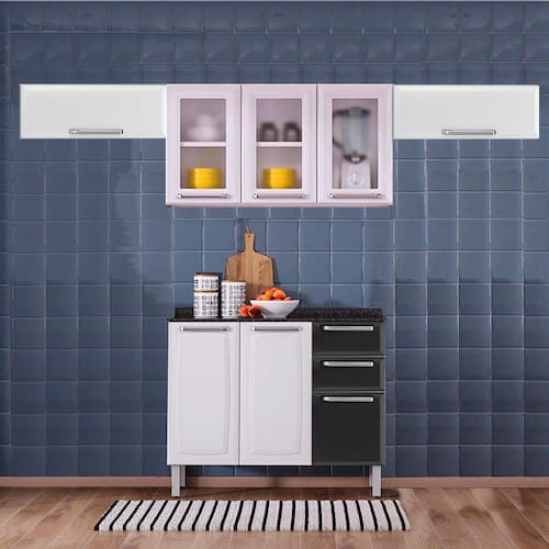 Modelo: Balcão Cozinha Itatiaia Luce 2 Portas 3 Gavetas Preto IG3G2-105 + Armário Aéreo 3 Portas 3 Vidros Luce Branco + 2 Armários Aéreos 1 Porta Horizontal Brancos Linha: Luce Material: Aço Pintura / Revestimento: corpo e porta revestidos com pintura eletrostática a pó Acabamento da pintura: brilho Corrediças: Telescópicas Quantidade de gavetas: 2 Quantidade de portas: 8 Quantidade de prateleiras: 7 Possuí Vidros: 3 Necessita Montagem: sim Sistema de montagem: Parafusos