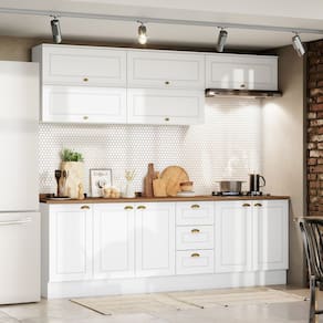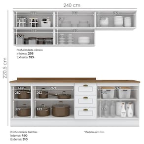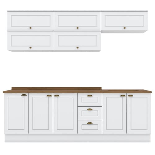 Cozinha modulado no estilo das clássicas cozinhas com conceito americano. Um conjunto modular de cozinha sendo 11 peças: 1 balcão de pia 120 cm (com tampo), 1 balcão de 80 cm (com tampo, já com recorte para cooktop de 4 bocas, com pré-marcação para cooktop de 5 bocas), 1 balcão de 40 cm (com tampo), 5 armários aéreos basculantes de 80 cm. Todo o conjunto com estrutura feita 100% MDF de 15mm (fundo com 3mm, tampos em MDF de 25mm), portas com dobradiças metálicas 35 mm com amortecimento, total de 3 prateleiras suportando até 8 kg cada. Acabamento em pintura UV texturizada (fosco), portas e gavetas com detalhes de usinagem em baixo relevo, além do destaque em seus puxadores em metal zamac. Opção de instalação sem pés, suspenso (ferragens para fixação na parede inclusas). Este móvel chegará na sua casa separado em 11 volumes.