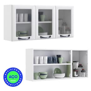 Cozinha Modulada 2 Peças Itatiaia Balcão 3 Portas e Armário Aéreo 3 Portas em Vidro Aço New Premium Branco