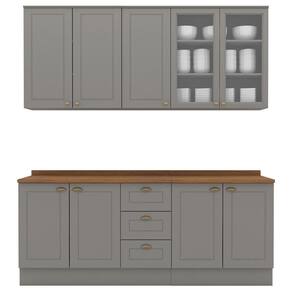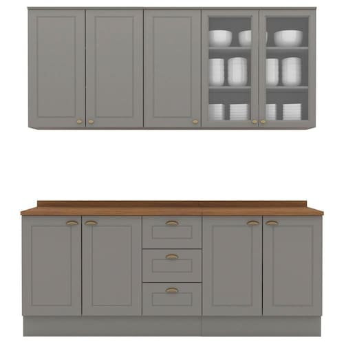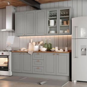 Conceito inspirado nas clássicas cozinhas estilo americano. Conjunto modular com 6 peças: 1 balcão de pia 120 cm (com tampo de 120 cm), 1 balcão de 80 cm (com tampo de 80 cm), 1 armário aéreo de 120 cm e 1 armário aéreo de 80 cm. Estrutura em MDF de 15mm (fundo 3mm, tampos em MDF de 25mm), com portas com dobradiças metálicas de 35 mm com amortecimento e fechamento suave, sendo 2 portas de vidro. Possui 7 prateleiras internas com capacidade para até 8 kg cada. Acabamento em pintura UV texturizada fosca, portas e gavetas com usinagem em baixo relevo, e puxadores em metal zamac. Instalação suspensa opcional com ferragens inclusas. Produto entregue em 06 volumes.