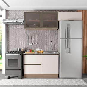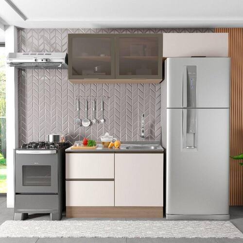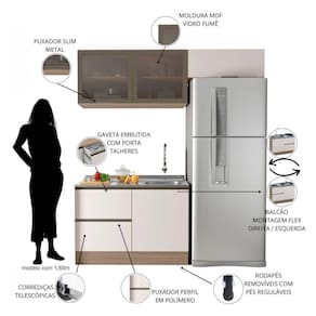 Medida de cada item (A x L x P): Aéreo 2 Portas Vidro: 59cm x 120cm x 37cm | Aéreo Geladeira: 30cm x 80cm x 37cm | Balcão 1 Porta 3 Gavetas: 86cm x 120cm x 50cm.