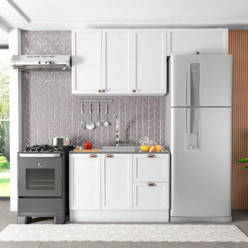 Informações Complementares: Portas de bater almofadadas/molduradas em MDF, balcão sem tampo para pia, corrediças telescópicas, dobradiças de 35mm, pistão a gás, prateleiras internas, puxadores retro em polímero, pés PVC reguláveis 14,5cm, rodapés removíveis com presilhas modelo clic