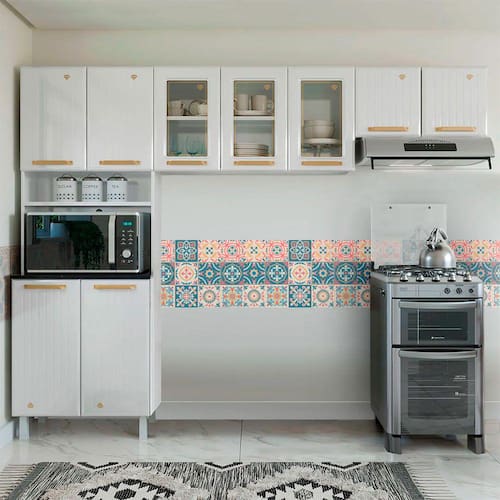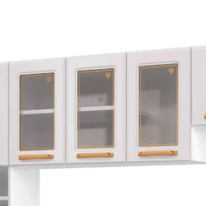 Armários lindos e espaçosos O Armário triplo fica na parte superior e traz 3 portas de vidro temperado. Aproveite para deixar louças e utensílios a mostra com toda segurança, e outras 3 portas superiores de aço. O armário duplo também em aço na parte inferior conta com mais opções para guardar até mesmo alimentos. Os contornos verticais e puxadores de plástico com um toque marcante dourado, aliados ao acabamento em pintura eletrostática resistente a corrosão vão dar ao ambiente uma personalidade única!