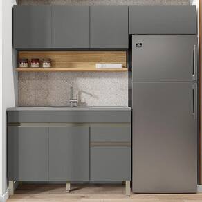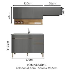 Cozinha Modulada 3 Peças, estilo moderno em módulos que se adaptam ao seu espaço! Produzido em MDP (15mm) com acabamento em pintura UV texturizada. Composta por 07 portas totais (portas superiores com sistema passante), gaveta com corrediças telescópicas, nicho decorativo, uma prateleira interna e puxadores em perfil alumínio (no balcão). Os pés reguláveis são em plástico resistente.