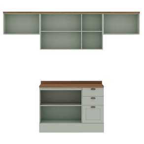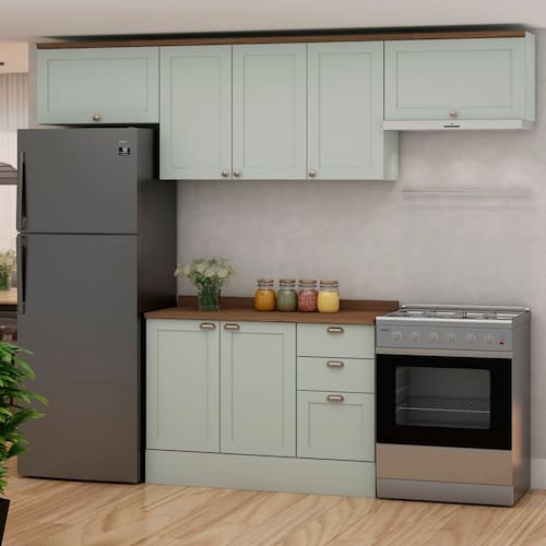 Transforme sua cozinha com a Iluminata, que combina beleza, praticidade e funcionalidade em um só produto! Acabamento da Prateleira: Pintura UV Escala de Brilho da Prateleira: Fosco Acabamento da Gaveta: Pintura UV Escala de Brilho da Gaveta: Fosco Material do Puxador da Gaveta: ABS Acabamento da Porta: Pintura UV Escala de Brilho da Porta: Fosco Material do Puxador da Porta: ABS Acabamento dos Pés: Pintura Acompanha Tampo: Sim Altura dos Pés: 17 cm Ambiente Principal: Cozinha Complexidade da Montagem: Média: pode ser montado por mais de uma pessoa e/ou necessite de maior conhecimento para montagem Cor: Verde Mint Cor do Produto: Verde Mint Cor Flex: Não Cor Interna: Mint Escala de Brilho: Fosco Espessura do Material da Estrutura: 15 mm Espessura do Tampo: 25 mm Gaveta com Chave: Não Informações Complementares: Cozinha Modulada 4 Peças 1 Balcão com Tampo 2 Aéreos 100% MDF Itens Inclusos: Cozinha Modulada 4 Peças 1 Balcão com Tampo 2 Aéreos 100% MDF e manual de montagem Linha ou Coleção: Iluminata Manual de Montagem e Instalação: https://product-hub-prd.madeiramadeira.com.br/911125/documents/1079d12c-452e-4861-a138-95ae50ba0e11198910173417169264828209.pdf Material da Dobradiça/Corrediça da Porta: Metálica Material da Gaveta: MDF Material da Porta: MDF Material da Prateleira: MDF Material dos Pés: ABS modular: Sim Montagem Flex: Não Necessita Montagem: Sim O Balcão Acompanha Pia: Não Origem do Produto: Nacional Pés Reguláveis: Sim Peso: 104,25 kg Peso Máximo por Gaveta: 5 kg Peso Máximo por Prateleira: 5 kg Possui Espelho: Não Possui Possui Pés: 09 Possui Portas: Sim Possui Prateleiras: Sim Possui Rodízio: Não Possui Vidro: Não Recomendações de Uso, Manutenção e Limpeza: Para retirada do número de identificação da peça, usar pano levemente umidecido com alcool, para limpeza em geral pano seco Sapatas Niveladoras: Sim Sistema de Montagem: Parafusos e Cavilhas e minifix Suporta Até (kg): 30 kg Tamanho Indicado da Pia: 120 Tipo de Corrediça da Gaveta: Telescópica Tipo de Dobradiça/Corrediça da Porta: Soft close Tipo de Puxador da Gaveta: Externo Tipo de Puxador da Porta: Externo