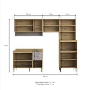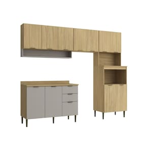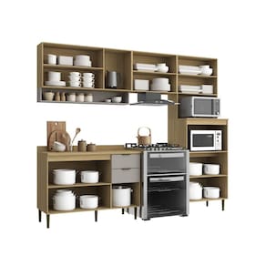 A Cozinha Modulada Ibiza é ideal para quem busca funcionalidade, estilo e organização. Com 12 portas e 2 gavetas, oferece amplo espaço de armazenamento. Fabricada 100% em MDF, combina resistência e design moderno. Sua tonalidade Louro Freijó/Cinza traz sofisticação, enquanto os puxadores em ABS bronze e os pés sextavados reguláveis garantem elegância e estabilidade. Dobradiças metálicas aumentam a durabilidade.