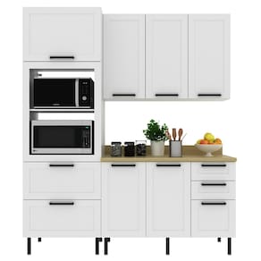 Conjunto de cozinha 04 peças, composto por um armário aéreo, uma torre quente e um balcão para pia com tampo. Balcão, Armário e Torre composto por estrutura 100% MDF 15mm com acabamento em pintura UV (brilho) e Tampo de 30mm com acabamento em pintura BP (semibrilho). Conta com 6 portas equipadas com dobradiças de 35 mm com amortecimento slow motion. Balcão com 3 gavetas com corrediças telescópicas (sendo uma com divisor de talheres), puxadores em alumínio e pés reguláveis em PVC com altura de 17 cm e detalhe cromado. Torre com porta basculante e duplo pistão a gás, 2 gavetas com corrediças telescópicas e 2 nichos abertos ideais para forno e micro-ondas (Medidas dos nichos: A.39cm x L.57,4cm x P.46,5cm / A.35,8cm x L.57,4cm x P.46,5cm). Toda linha contem portas com detalhes em usinagem de baixo relevo no estilo provençal. Excelente para quem busca um móveis funcionais e ótimo desempenho. Este móvel chegará na sua casa separado em 07 volumes.