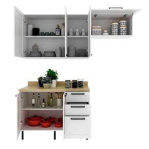 Conjunto de cozinha 04 peças, composto por dois armários aéreos (120cm e 80cm) e um balcão para pia com tampo. Balcão e Armários Aéreos compostos por estrutura 100% MDF 15mm com acabamento em pintura BP (brilho) e Tampo de 30mm com acabamento em pintura BP (semibrilho). Conta com 5 portas equipadas com dobradiças de 35 mm com amortecimento slow motion, Aéreo de 80cm com porta basculante e duplo pistão a gás, com detalhes em usinagem de baixo relevo no estilo provençal. Balcão com 3 gavetas com corrediças telescópicas (sendo uma com divisor de talheres), puxadores em alumínio e pés reguláveis em PVC com altura de 17 cm e detalhe cromado. Excelente para quem busca um móveis funcionais e ótimo desempenho. Este móvel chegará na sua casa separado em 06 volumes.