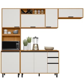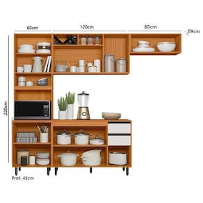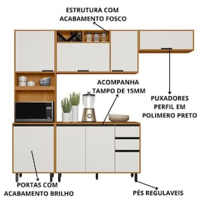 Transforme seu ambiente com a Cozinha Modulada 4 Peças sendo Balcão com Tampo, conta com excelente qualidade e acabamento de alto padrão, possui estrutura em MDP 15mm e tampo de 15mm de espessura, com pintura UV. Composta por 8 portas com dobradiças reforçadas de 26mm, sendo 2 das portas basculante equipadas com pistão a gás, conta também com 2 gavetas com corrediças telescópicas que possibilita a abertura total. O Paneleiro possui compartimento exclusivo para micro-ondas ( x x , proporcionando praticidade e aproveitamento de espaço além do nicho decorativo ( x x O Balcão permite acomodar uma pia de até 120 cm x 50 cm e para usar o balcão para pia a fixação dos afastadores é de montagem obrigatória. O acabamento acetinado nas portas proporciona um toque de sofisticação, puxadores em polímero preto, prateleiras internas com amplo espaço para armazenamento, pés reguláveis de 17 cm em PVC. Este conjunto é ideal para quem busca aliar estética e praticidade, transformando a cozinha em um espaço agradável e eficiente. Este móvel chegará em sua casa separado em 4 volumes.
