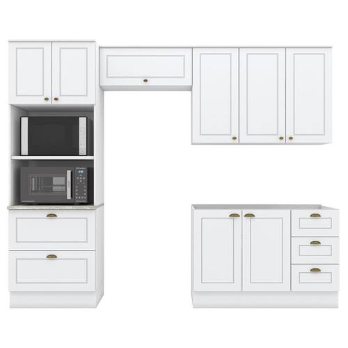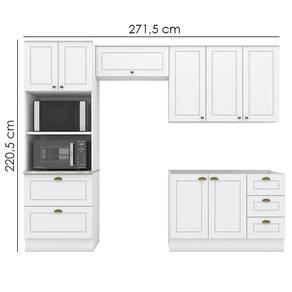 Conceito inspirado nas clássicas cozinhas estilo americano. Um conjunto modular de cozinha sendo 4 peças: 1 balcão de pia 120 cm (sem tampo)(não acompanha pia), 1 armário aéreo de 120 cm, 1 armário aéreo basculante de 80 cm e 1 torre quente de 72 cm, com espaços para 2 eletros, (espaço para eletros: 1 - A: 42,4 x L: 68,4 x P: 48 cm | 2 - A: 38,6 x L: 68,4 x P: 53,3 cm). Todo o conjunto com estrutura feita 100% MDF de 15mm (fundo com 3mm, tampo em MDP de 25mm), portas com dobradiças metálicas 35 mm com amortecimento, total de 5 prateleiras suportando até 8 kg. Todo o conjunto com acabamento em pintura UV texturizada (fosco), portas e gavetas com detalhes de usinagem em baixo relevo, além do destaque em seus puxadores em metal zamac. Opção de instalação sem pés, suspenso (ferragens para fixação na parede inclusas). Este móvel chegará na sua casa separado em 06 volumes.