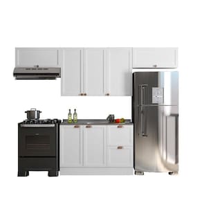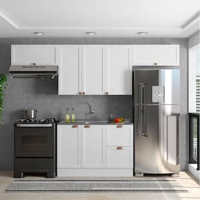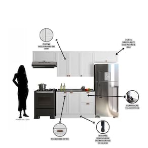 Informações Complementares: Portas de bater almofadadas/molduradas em MDF, balcão sem tampo para pia, corrediças telescópicas, dobradiças de 35mm, pistão a gás, prateleiras internas, puxadores retro em polímero, pés PVC reguláveis 14,5cm, rodapés removíveis com presilhas modelo clic