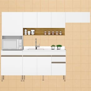 Cozinha Modulada 4 Peças, estilo moderno em módulos que se adaptam ao seu espaço! Produzido em MDP (15mm) com acabamento em pintura UV texturizada. Composta por 09 portas totais (sendo uma delas basculante e superiores com sistema passante), gaveta com corrediças telescópicas, nicho decorativo e nicho para microondas/forno, prateleiras internas, passa fio embutido e puxadores em perfil alumínio (portas inferiores). Os pés reguláveis são em plástico resistente. PIA/TAMPO NÃO INCLUSOS. Este produto será entregue em 05 volumes.
