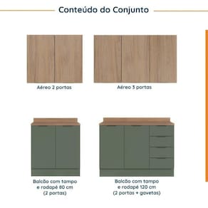 A Cozinha Ipanema é um móvel com design moderno, feito com material de qualidade para garantir alta durabilidade e resistência contra umidade. conferem versatilidade e praticidade no dia a dia, permitindo armazenar diferentes objetos. Uma opção de móvel prático e funcional para quem busca organização e estilo em sua casa. Altura do Conjunto: 93 cm Ambiente Principal: Cozinha codigo_ean: 7909903352311 Cor: Acácia/Verde Folha/Branco Cor do Produto: Acácia/Verde Folha/Branco Informação Complementar: 1x Armário Aéreo 3 Portas 120cm Puxador 150mm Ipanema Acácia/BrancoLargura: 120 cmAltura: 69,5 cmPeso: 31,44 kgProfundidade: 36,7 cmNecessita Montagem: Sim1x Armário Aéreo 2 Portas Ipanema Acácia/BrancoLargura: 80 cmAltura: 69,5 cmPeso: 20,97 kgProfundidade: 36,7 cmNecessita Montagem: Sim1x Balcão 2 Portas Com Tampo e Rodapé Ipanema Verde Folha/BrancoLargura: 80 cmAltura: 93 cmPeso: 32,59 kgProfundidade: 52 cmNecessita Montagem: Sim1x Balcão Pia 2 Portas 4 Gavetas com Tampo e Rodapé Ipanema Verde Folha/BrancoLargura: 120 cmAltura: 93 cmPeso: 54,06 kgProfundidade: 52 cmNecessita Montagem: Sim