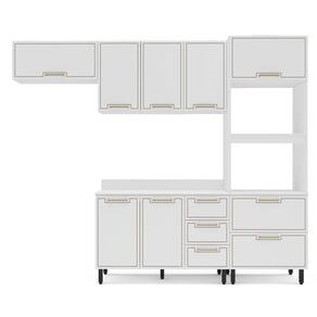 Caracteristicas: 4 Gavetas com corredicas telescopicas, que suportam peso maximo de 3 kg 2 Nichos para forno e micro-ondas 8 Portas bater com dobradicas metalicas e basculante com pistao a gas 3 Prateleiras que suportam peso maximo de 5 kg Acabamento em pintura UV Semi-Fosco Base balcao com 3 gavetas suporta peso maximo 10kg Estrutura em MDF/MDP Itens Inclusos Kit Ferragens e Manual de Montagem Pes regulaveis Peso maximo suportado o tampo 15 kg Puxadores de aluminio