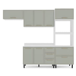 Caracteristicas: 4 Gavetas com corredicas telescopicas, que suportam peso maximo de 3 kg 2 Nichos para forno e micro-ondas 8 Portas bater com dobradicas metalicas e basculante com pistao a gas 3 Prateleiras que suportam peso maximo de 5 kg Acabamento em pintura UV Semi-Fosco Base balcao com 3 gavetas suporta peso maximo 10kg Estrutura em MDF/MDP Itens Inclusos Kit Ferragens e Manual de Montagem Pes regulaveis Peso maximo suportado o tampo 15 kg Puxadores de aluminio