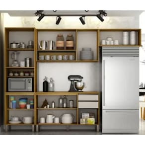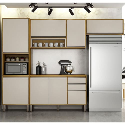 Características: 2 Gavetas, sendo 1 com divisor de talheres 10 Portas sendo duas basculantes com pistão a gás Acabamento alta qualidade, ideal para cozinhas planejadas Composição 4 peças modulares com tampo Design moderno, funcional e sofisticado Dobradiças metálicas Estrutura em MDF/MDP 15mm Paneleiro Cristaleira, com espaço para micro-ondas e portas em vidro reflecta Pés reguláveis para melhor ajuste ao piso Puxadores em alumínio