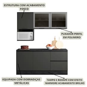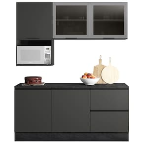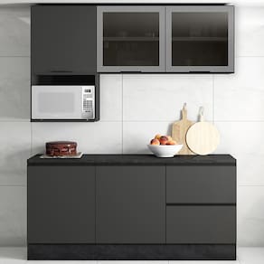 Cozinha Modulada 5 Peças sendo Balcão com Tampo, conta com excelente qualidade e acabamento de alto padrão, projetada para oferecer funcionalidade e elegância para sua cozinha, possui estrutura em MDP 15mm e tampo de 27mm de espessura, pintura UV acetinada. Composta por 5 portas sendo 2 das portas em vidro fume, com dobradiças metálicas de 35 mm e função slow motion, proporcionando um fechamento suave e silencioso, conta também com 2 gavetas, sendo uma com porta-talheres incluso. Todas são equipadas com corrediças telescópicas, permitindo abertura total e acesso facilitado aos utensílios. Nicho para acomodar micro-ondas ou forno medindo A.39 cm x L.55 cm x P.45 cm, prateleiras internas com amplo espaço para armazenamento, puxadores em polímero com acabamento de alta qualidade conferem um toque moderno ao design dos móveis. Os pés em PVC de 14,5cm são reguláveis, garantindo o nivelamento perfeito dos moveis. Além disso, os rodapés possuem presilhas modelo click na espessura de 15 mm, facilitando sua remoção quando necessário. Este conjunto é ideal para quem busca aliar estética e praticidade, transformando a cozinha em um espaço agradável e eficiente. Este móvel chegará em sua casa separado em 7 volumes.