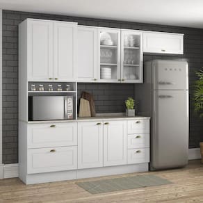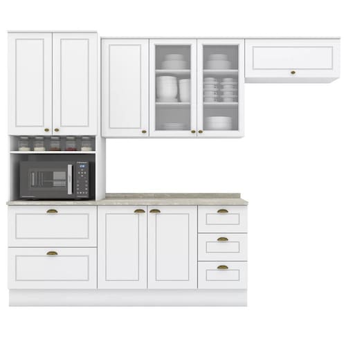 Conceito inspirado nas clássicas cozinhas estilo americano. Um conjunto modular de cozinha sendo 5 peças: 1 balcão de pia 120 cm (com tampo de 120 cm), 1 armário aéreo de 120 cm, 1 armário aéreo basculante de 80 cm e 1 torre quente de 72 cm (espaço para eletro: A: 38,6 x L: 68,4 x P: 53,3 cm). Todo o conjunto com estrutura feita 100% MDF de 15mm (fundo com 3mm, tampo em MDP de 25mm), portas com dobradiças metálicas 35 mm com amortecimento sendo 2 portas de vidro, total de 6 prateleiras suportando até 8 kg. Todo o conjunto com acabamento em pintura UV texturizada (fosco), portas e gavetas com detalhes de usinagem em baixo relevo, além do destaque em seus puxadores em metal zamac. Opção de instalação sem pés, suspenso (ferragens para fixação na parede inclusas). Este móvel chegará na sua casa separado em 07 volumes.