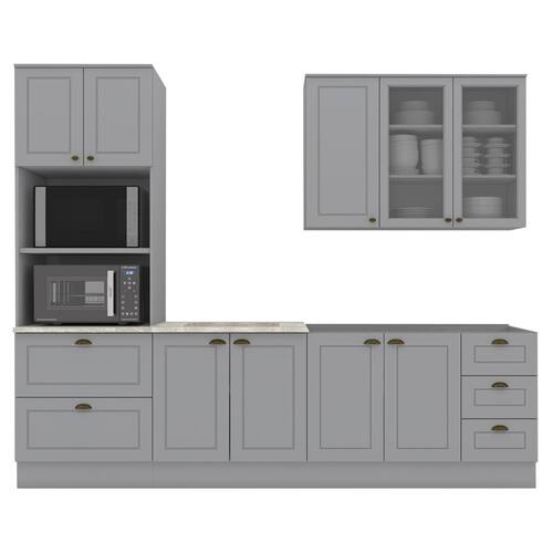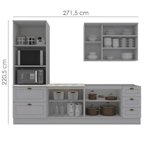 Conceito inspirado nas clássicas cozinhas estilo americano. Um conjunto modular de cozinha sendo 5 peças: 1 balcão de pia 120 cm (sem tampo)(não acompanha pia), 1 balcão de 80 cm (com tampo de 80 cm, usinado para cooktop de 4 bocas, com pré-marcação para cooktop de 5 bocas)(NÃO ACOMPANHA FOGÃO COOKTOP), 1 armário aéreo de 120 cm e 1 torre quente de 72 cm, com espaços para 2 eletros, (espaço para eletros: 1 - A: 42,4 x L: 68,4 x P: 48 cm | 2 - A: 38,6 x L: 68,4 x P: 53,3 cm). Todo o conjunto com estrutura feita 100% MDF de 15mm (fundo com 3mm, tampo em MDP de 25mm), portas com dobradiças metálicas 35 mm com amortecimento sendo 2 portas de vidro, total de 5 prateleiras suportando até 8 kg. Todo o conjunto com acabamento em pintura UV texturizada (fosco), portas e gavetas com detalhes de usinagem em baixo relevo, além do destaque em seus puxadores em metal zamac. Opção de instalação sem pés, suspenso (ferragens para fixação na parede inclusas). Este móvel chegará na sua casa separado em 07 volumes.