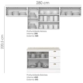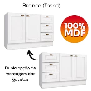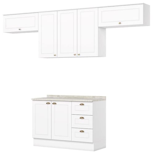 No estilo provençal com conceito inspirado nas cozinhas estilo americano. Um conjunto modular de cozinha sendo 5 peças: 3 Armários Aéreos (2 aéreo basculante 80 cm e 1 aéreo 3 portas 120 cm) e 1 balcão de 120 cm e 1 tampo de 120 cm. Todo o conjunto com estrutura feita 100% MDF de 15mm (fundo com 3mm, tampo em MDP de 25mm) , portas com dobradiças metálicas 35 mm com amortecimento e fechamento suave, e 3 gavetas com corrediças telescópicas, suportando 3kg cada, sua interna conta com 4 prateleiras espaçosas, cada uma suportando até 8 kg. Cozinha com acabamento em pintura UV texturizada, com portas e gavetas com detalhes de usinagem em baixo relevo que proporciona beleza e facilidade ao limpar, além do destaque em seus puxadores em metal zamac, tampo de 120 x 53,5 cm. Este móvel chegará na sua casa separado em 05 volumes.