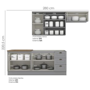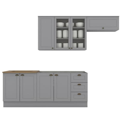 Conceito inspirado nas clássicas cozinhas estilo americano. Um conjunto modular de cozinha sendo 5 peças: 1 balcão de pia 120 cm (sem tampo)(NÃO ACOMPANHA PIA), 1 balcão de 80 cm (com tampo usinado para cooktop de 4 bocas, com pré-marcação para cooktop de 5 bocas (NÃO ACOMPANHA FOGÃO COOKTOP), 1 armário aéreo de 120 cm e 1 armário aéreo basculante de 80 cm. Todo o conjunto com estrutura feita 100% MDF de 15mm (fundo com 3mm, tampo em MDF 25mm), portas com dobradiças metálicas 35 mm com amortecimento sendo 2 portas de vidro, total de 4 prateleiras suportando até 8 kg. Todo o conjunto com acabamento em pintura UV texturizada (fosco), portas e gavetas com detalhes de usinagem em baixo relevo, além do destaque em seus puxadores em metal zamac. Opção de instalação sem pés, suspenso (ferragens para fixação na parede inclusas). Este móvel chegará na sua casa separado em 05 volumes.