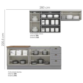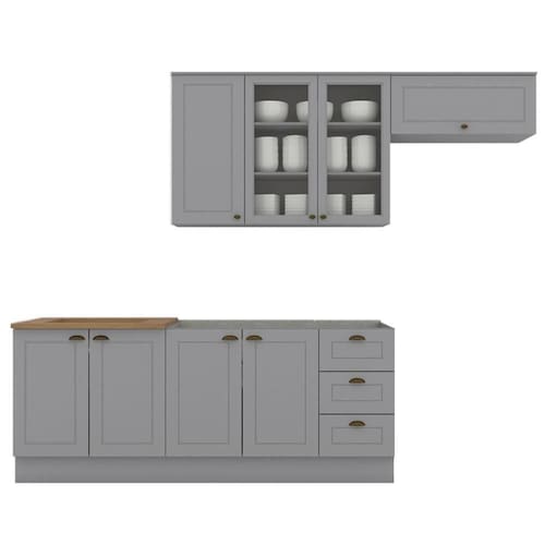 Conceito inspirado nas clássicas cozinhas estilo americano. Conjunto modular com 5 peças: 1 balcão de pia 120 cm (sem tampo) (NÃO ACOMPANHA PIA), 1 balcão de 80 cm (com tampo usinado para cooktop de 4 bocas, com pré-marcação para cooktop de 5 bocas) (NÃO ACOMPANHA FOGÃO COOKTOP), 1 armário aéreo de 120 cm e 1 armário aéreo basculante de 80 cm. Estrutura em MDF de 15mm (fundo com 3mm, tampo em MDF 25mm). Portas com dobradiças metálicas 35 mm com amortecimento, sendo 2 portas de vidro. Conta com 4 prateleiras com capacidade de até 8 kg cada. Acabamento em pintura UV texturizada (fosco). Portas e gavetas com usinagem em baixo relevo e puxadores em metal zamac. Opção de instalação suspensa (ferragens inclusas). Entregue em 05 volumes.