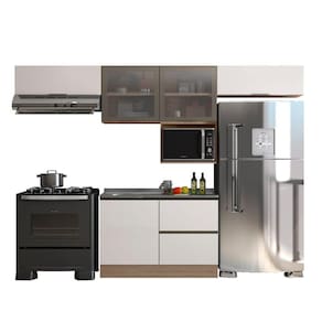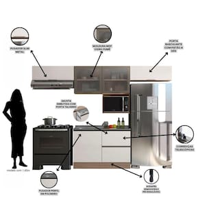 Informações Complementares: Porta basculante com pistão a gás, porta moldurada com vidro fumê, gaveta embutida com porta talheres, balcão sem tampo para pia deslocada, nicho micro-ondas, corrediças telescópicas, rodapés removíveis com presilhas modelo click e pés reguláveis de 14,5c