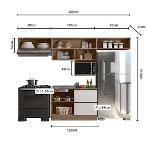 Medida de cada item (A x L x P): Aéreo 2 Portas Vidro: 59cm x 120cm x 37cm | Aéreo Geladeira: 30cm x 80cm x 37cm, Aéreo Geladeira: 30cm x 80cm x 37cm | Nicho Micro-ondas:43cm x 58cm x 45cm | Balcão 1 Porta 3 Gavetas: 86cm x 120cm x 50cm.