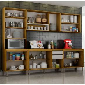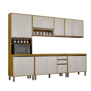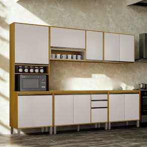 Características: 2 Gavetas, sendo 1 com divisor de talheres 11 Portas sendo duas basculantes com pistão a gás Acabamento alta qualidade, ideal para cozinhas planejadas Composição 5 peças modulares com tampo Design moderno, funcional e sofisticado Dobradiças metálicas Estrutura em MDF/MDP 15mm Paneleiro cristaleira, com espaço para micro-ondas e portas em vidro reflecta Pés reguláveis para melhor ajuste ao piso Puxadores em alumínio