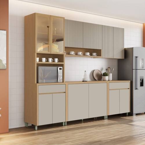 Caracteristicas: Corredicas telescopicas Nicho Vidro Reflecta com dobradicas Caneco 35 mm no paneleiro Material 100 em MDF Pes regulaveis de 10 cm Possui organizador de talheres Possui chapa Duratree, anti-mofo Puxadores ocultos Peso suportado por prateleiras 15kg Portas canelada nos armarios aereos 12 Portas 2 Gavetas
