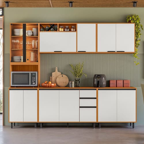 Compoe a cozinha: 1 Paneleiro cristaleira com 4 portas de bater, sendo 2 com vidro incolor e iluminacao em LED 1 Balcao de 120cm 3 Portas 2 Gavetas e acompanha tampo com 15mm de espessura 1 Armario aereo de 120cm 2 Portas e nicho garrafeiro 1 Armario aereo de 80cm 2 Portas 1 Balcao de 80cm 2 Portas