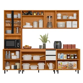 Cozinha Modulada 5 Pecas sem Pia Ravena Poliman Transforme sua cozinha em um espaco moderno, elegante e altamente funcional com a Cozinha Modulada 5 Pecas Ravena Poliman. Desenvolvida para quem busca praticidade sem abrir mao do design sofisticado, ela reune solucoes inteligentes de organizacao e detalhes que fazem toda a diferenca no dia a dia. O paneleiro cristaleira e um dos grandes destaques, trazendo 4 portas de bater, sendo 2 com vidro incolor e iluminacao em LED, que proporcionam um toque de sofisticacao e permitem expor loucas e objetos decorativos de maneira charmosa. Alem disso, possui nicho para micro-ondas e nicho decorativo , garantindo praticidade e estilo. O balcao de 120cm acompanha tampo de 15mm de espessura, que pode ser removido para instalacao de pia no padrao 120x50cm. Ja o aereo de 120cm, equipado com pistao a gas, conta com nicho garrafeiro unindo funcionalidade e design moderno. O aereo de 80cm vem com prateleira interna, enquanto o balcao de 80cm inclui prateleira movel, ideal para acomodar utensilios ou objetos maiores. O tampo ainda pode ser recortado conforme orientacoes do manual para a instalacao de cooktop, tornando o conjunto ainda mais versatil. Produzida em MDP com pintura UV acetinada, a Cozinha Ravena alia resistencia, durabilidade e acabamento impecavel. Conta com dobradicas reforcadas de 26mm, corredicas telescopicas. A Cozinha Modulada 5 Pecas Ravena Poliman e a escolha perfeita para quem deseja aliar qualidade, praticidade e design moderno em um unico ambiente.