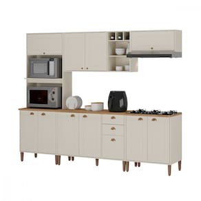 Compõe a cozinha : 1 Paneleiro torre quente 1 Armário aéreo com 2 portas e nichos 1 Armário aéreo de 1 porta 1 Balcão para pia, sem tampo e sem pia 1 Balcão 2 Portas