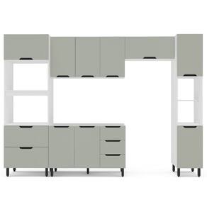 Caracteristicas: 4 Gavetas com corredicas telescopicas 4 Nichos sendo dois para forno e micro-ondas 10 Portas e tres sendo basculantes com pistao a gas Acabamento FF em Pintura UV Base do balcao 10kg distribuidos Dobradicas de metal Estrutura em MDP 15mm Gavetas com capacidade ate 3kg Pes com regulagem Puxadores cava Prateleiras com capacidade de 5 a 10kg