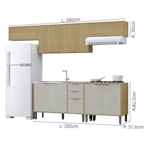 Cozinha Montada: Altura: 210,5 cm | Comprimento Superior: 280 cm | Comprimento Inferior: 200 cm | Profundidade: 51,6 cm