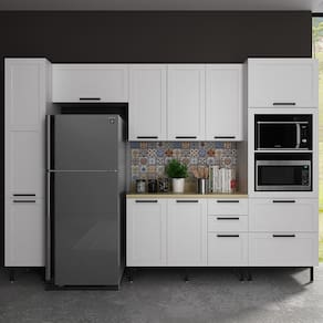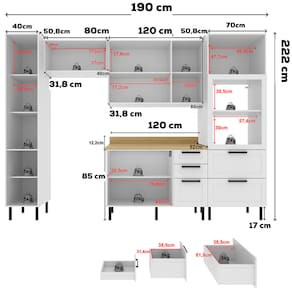 Conjunto de cozinha 06 peças, composto por composto por dois armários aéreo (120cm e 80cm), uma torre quente um paneleiro um balcão para pia com tampo. Balcão, Armários, Torre e Paneleiro composto por estrutura 100% MDF 15mm com acabamento em pintura UV (brilho) e Tampo de 30mm com acabamento em pintura BP (semibrilho). Conta com 7 portas equipadas com dobradiças de 35 mm com amortecimento slow motion e 2 portas basculante e duplo pistão a gás. Balcão com 3 gavetas com corrediças telescópicas (sendo uma com divisor de talheres), puxadores em alumínio e pés reguláveis em PVC com altura de 17 cm e detalhe cromado. Torre com 2 gavetas com corrediças telescópicas e 2 nichos abertos ideais para forno e micro-ondas (Medidas dos nichos: A.39cm x L.57,4cm x P.46,5cm / A.35,8cm x L.57,4cm x P.46,5cm). Paneleiro com 4 prateleiras internas. Toda linha contem portas com detalhes em usinagem de baixo relevo no estilo provençal. Excelente para quem busca um móveis funcionais e ótimo desempenho. Este móvel chegará na sua casa separado em 09 volumes.