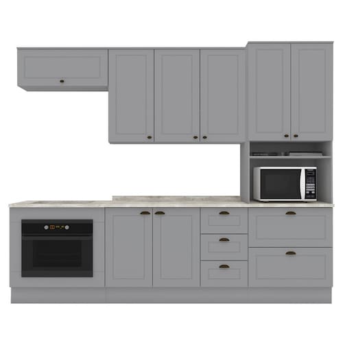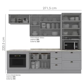 MDFCozinha modulada no estilo das clássicas cozinhas com conceito americano. Um conjunto modular de cozinha sendo 7 peças: 1 balcão de pia 120 cm (com tampo de 120 cm), 1 balcão de embutir de 80 cm para forno (com tampo de 80 cm, usinado já com recorte para cooktop de 4 bocas e com pré-marcação para cooktop de 5 bocas), 1 armário aéreo de 120 cm, 1 armário aéreo basculante de 80 cm e 1 torre quente de 71,5 cm, com 1 nicho suspenso, espaço para forno/micro ondas (espaço para eletro: A: 386 x L: 684 x P: 533 mm). Todo o conjunto com estrutura feita 100% MDF de 15mm (fundo com 3mm, tampo em MDP de 25mm), portas com dobradiças metálicas 35 mm com amortecimento, total de 6 prateleiras suportando até 8 kg. Acabamento em pintura UV texturizada (fosco), portas e gavetas com detalhes de usinagem em baixo relevo, além do destaque em seus puxadores em metal zamac. Opção de instalação sem pés, suspenso (ferragens para fixação na parede inclusas). Este móvel chegará na sua casa separado em 09 volumes.