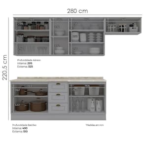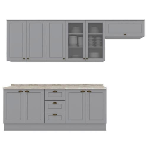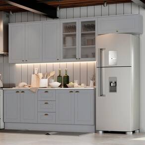 Cozinha modulada inspirada nas clássicas cozinhas com conceito americano. Conjunto com 7 peças: 1 balcão de pia 120 cm (com tampo de 120 cm), 1 balcão de 80 cm (com tampo de 80 cm), 1 armário aéreo 120 cm, 1 armário aéreo basculante 80 cm e 1 armário aéreo 80 cm.