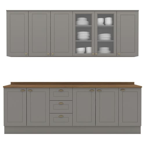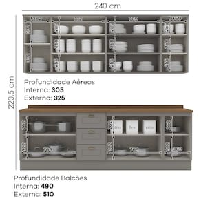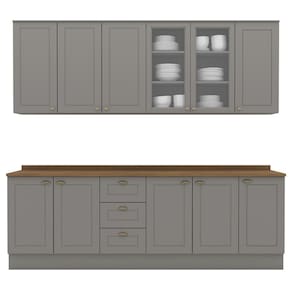 MDFCozinha modulado no estilo das clássicas cozinhas com conceito americano. Um conjunto modular de cozinha sendo 9 peças: 1 balcão de pia 120 cm (com tampo), 1 balcão de 80 cm (com tampo), 1 balcão de 40 cm (com tampo) 1 armário aéreo de 120 cm, 1 armário aéreo de 80 cm e 1 armário aéreo de 40 cm. Todo o conjunto com estrutura feita 100% MDF de 15mm (fundo com 3mm, tampos em MDF de 25mm), portas com dobradiças metálicas 35 mm com amortecimento sendo 2 portas de vidro, total de 10 prateleiras suportando até 8 kg cada. Acabamento em pintura UV texturizada (fosco), portas e gavetas com detalhes de usinagem em baixo relevo, além do destaque em seus puxadores em metal zamac. Opção de instalação sem pés, suspenso (ferragens para fixação na parede inclusas). Este móvel chegará na sua casa separado em 9 volumes.