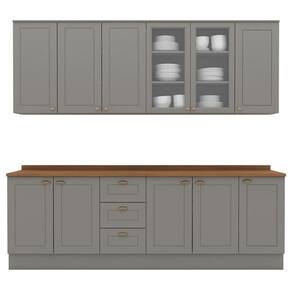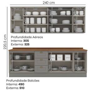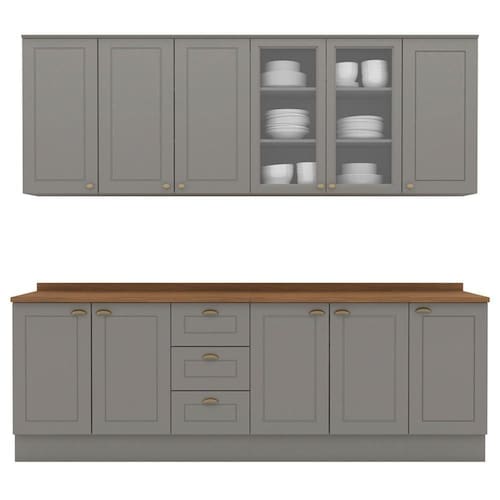 Cozinha modulada no estilo das clássicas cozinhas com conceito americano. Um conjunto modular com 9 peças: 1 balcão de pia 120 cm (com tampo), 1 balcão de 80 cm (com tampo), 1 balcão de 40 cm (com tampo), 1 armário aéreo de 120 cm, 1 armário aéreo de 80 cm e 1 armário aéreo de 40 cm. Estrutura feita em MDF de 15mm (fundo com 3mm, tampos em MDF de 25mm), portas com dobradiças metálicas 35 mm com amortecimento sendo 2 portas de vidro. Possui 10 prateleiras com capacidade para até 8 kg cada, acabamento em pintura UV texturizada (fosco), portas e gavetas com usinagem em baixo relevo e puxadores em metal zamac. Opção de instalação suspensa, sem pés (ferragens inclusas). Produto enviado em 9 volumes.