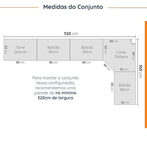 Cozinha Modulada formada por 4 Aéreos 4 Balcões e 1 Torre Quente, as portas e frentes de gaveta são feitas em MDF e possuem acabamento em Finish Foil com dobradiças com amortecimento, possibilitando fechamento soft closing. Possuem fita de borda em PVC, conferindo alta durabilidade e proteção contra umidade ao móvel.